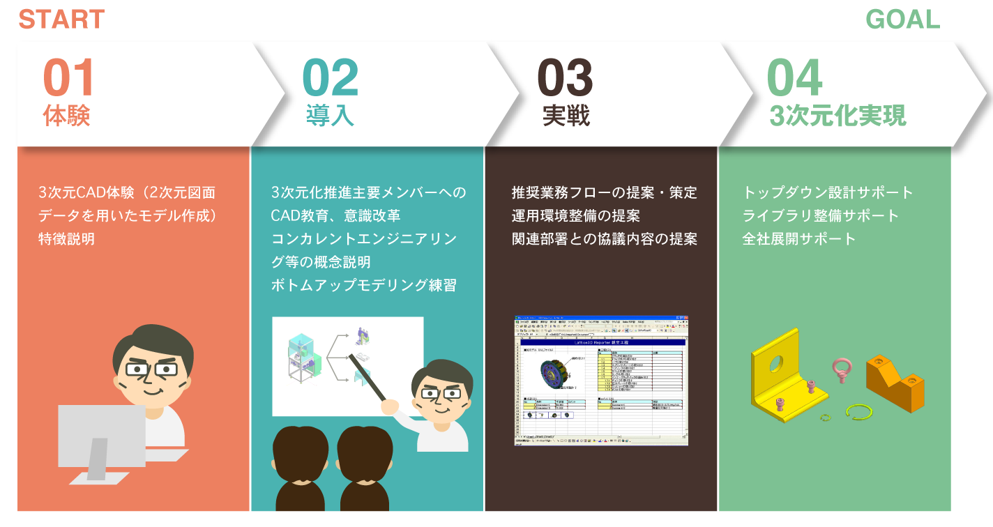 弊社が取り組んできた3次元CADを活用した設計手法や3次元化に向けた社内整備の手段などをご提案いたします。